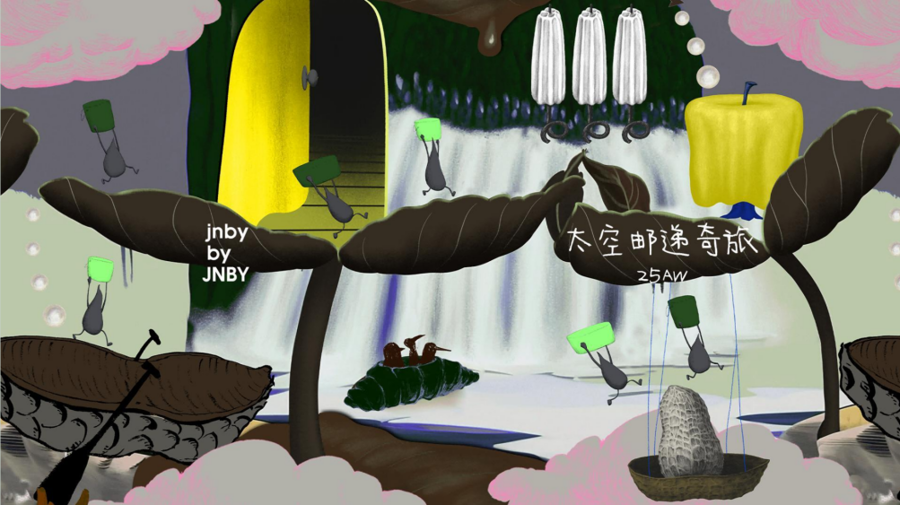 jnby by JNBY25秋冬系列则围绕“土豆星球”的童话展开:原本干涸的星球,在小熊邮递员送达象征“自由、希望与想象力”的“一片水”后重焕生机。品牌生动描绘了《星球观察日记四则》、《任意门》、《宇宙邮递奇迹前传》等多个奇幻旅程中的星际场景,提取叶子雨滴、熊掌热气球、苹果飞船、大象园艺师等奇幻元素融入服装,激发小朋友们对自然、宇宙与生命的无限好奇与表达欲望。